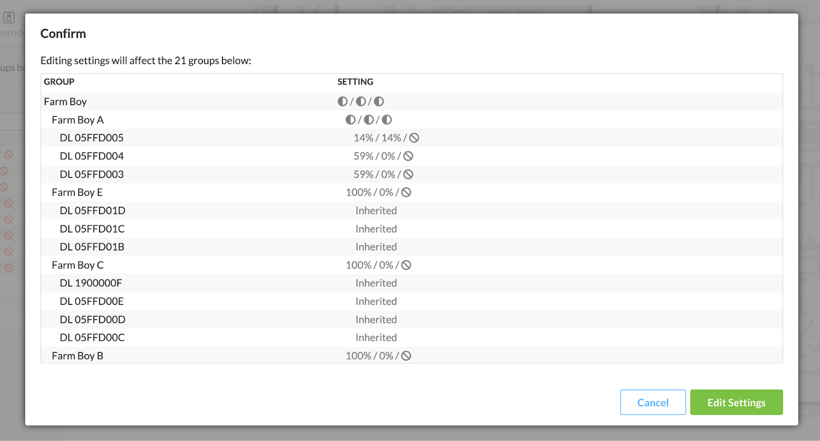 When a user clicks Edit Settings, a new dialog appears showing what will be affected by any changes being made.
