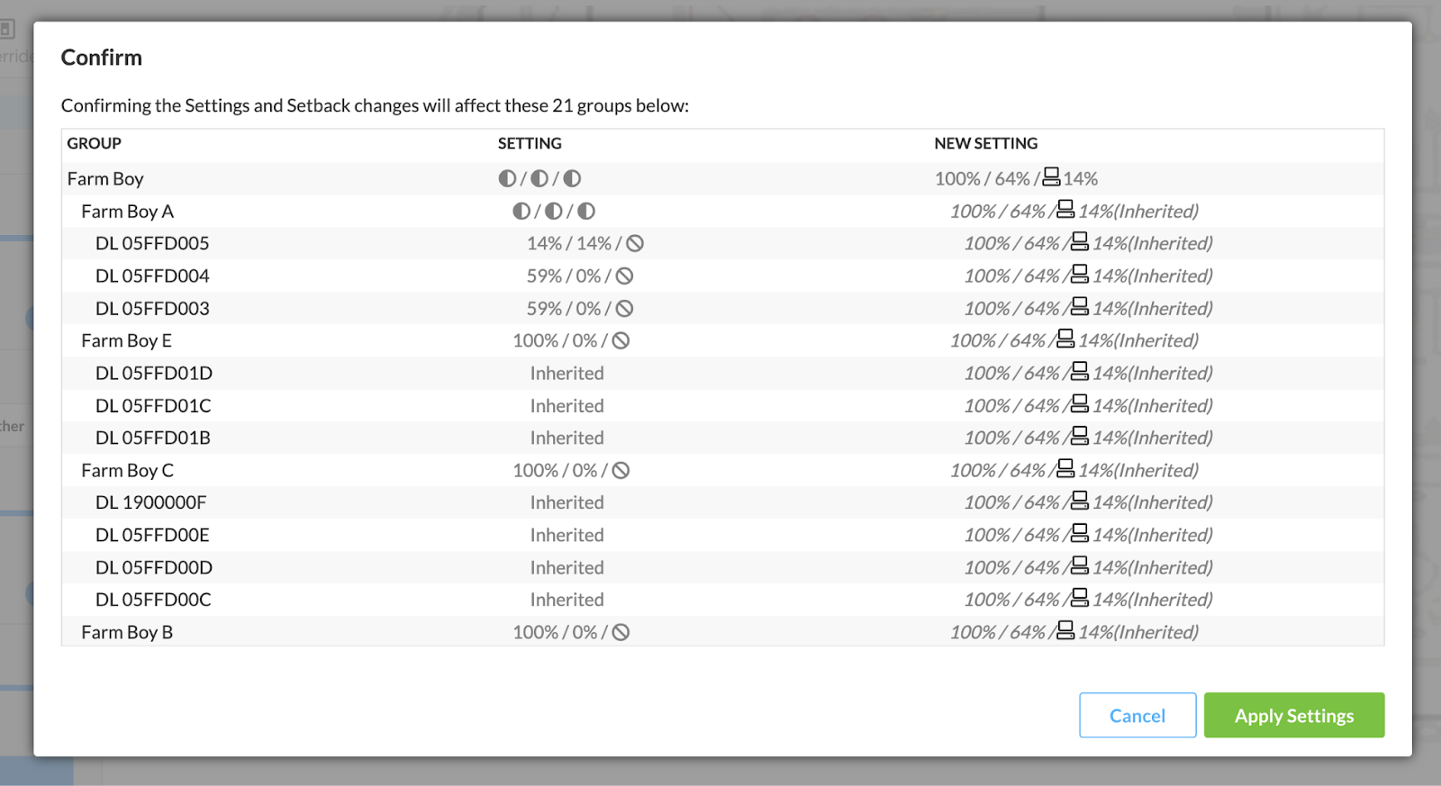 We’ve improved the lighting settings user interface tools. Now, users can easily view current parent and child group settings at a glance, and edits to existing settings will be clearly explained before being implemented.