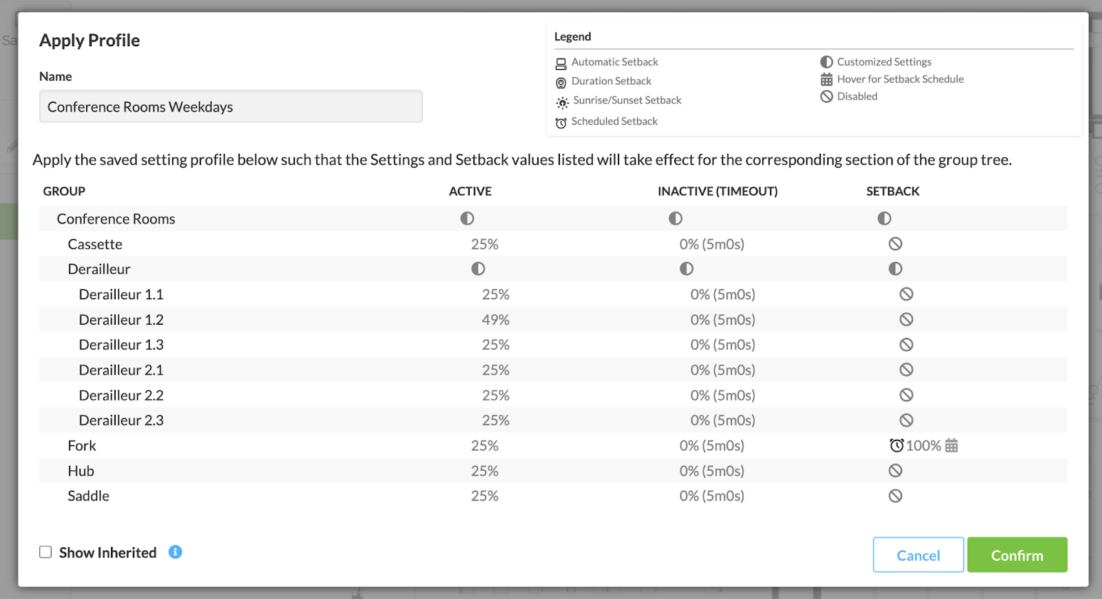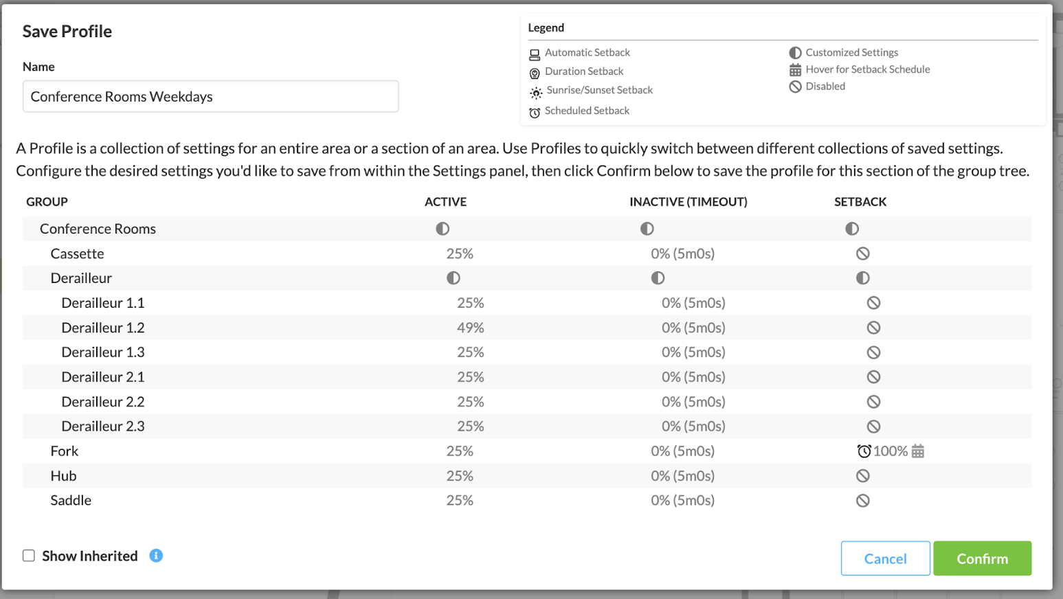 To apply a Profile, click Saved, then hover over the Profile you’d like to apply – the Apply Profile button will appear. After applying a Profile, all fixtures in the facility will move to the settings specified in that saved Profile.